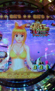 もう、やめちゃおっかなって思ってた30回転くらい、ミステリーステージにてY字チャンス目から4シングルリーチ。シャチ出現から催眠リーチ。で、ボタンプッシュで泡……だけど、なんかボタン硬い。これ、アツいって書いてあったような。ほら、当たった。しかも、昇格スクロール発生しちゃったり。
